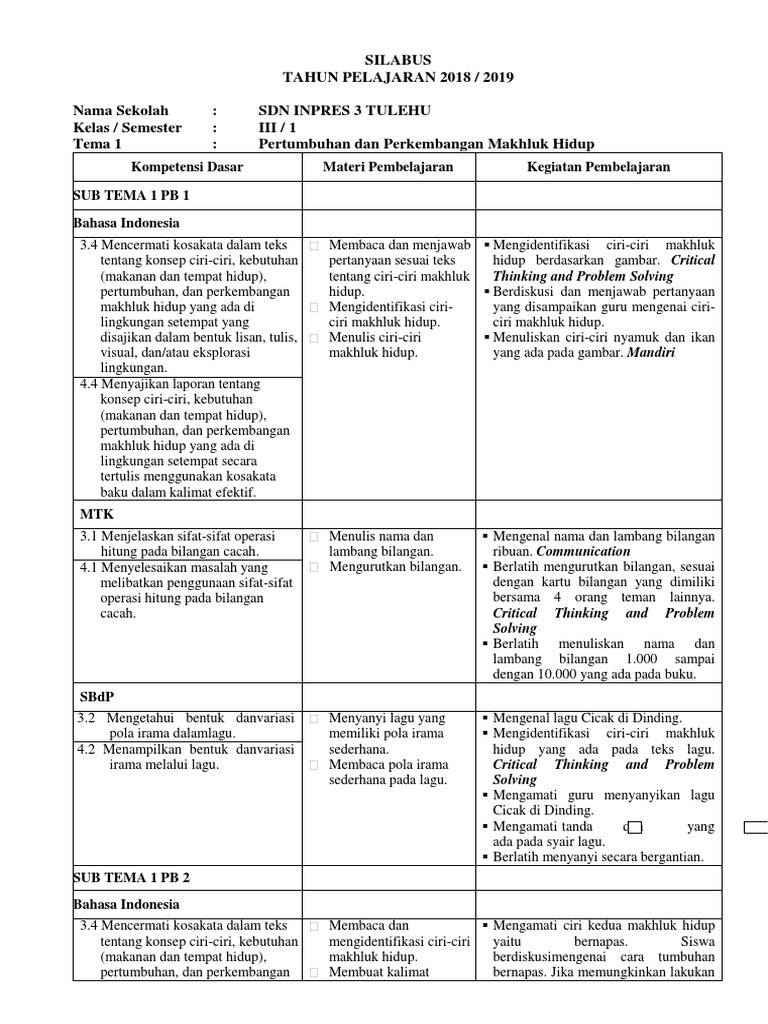 Silabus tunagrahita kelas 9 tema 3 subtema 1. Rpp k13 sd kelas 1 semester 1 tema 1 subtema 1 unduh di sini. Untuk postingan selanjutnya akan kami bahas tentang soal tematik kelas 3 tema 7 subtema 3 perkembangan teknologi komunikasi. Bismillah video ini berisi materi tematik kelas 3 tema 2 (menyayangi tumbuhan dan hewan) subtema 1 (manfaat tumbuhan bagi kehidupan manusia) pembelajaran 1. Nah pada penyusunan rpp tematik kelas 3 tema 2 format 1 lembar / halaman ini sudah disesuaikan dengan silabus.
